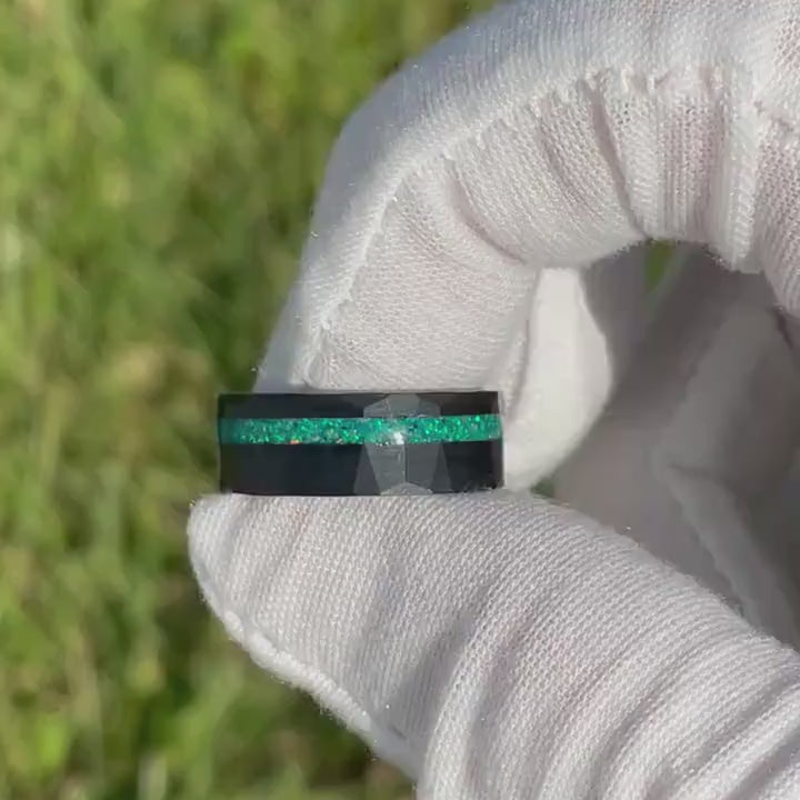 Enigma – crushed green opal – a stunning blend of mystery and fascination. This couple's ring set features the mesmerizing beauty of crushed green opal, symbolizing the enigmatic and profound connection between you.
