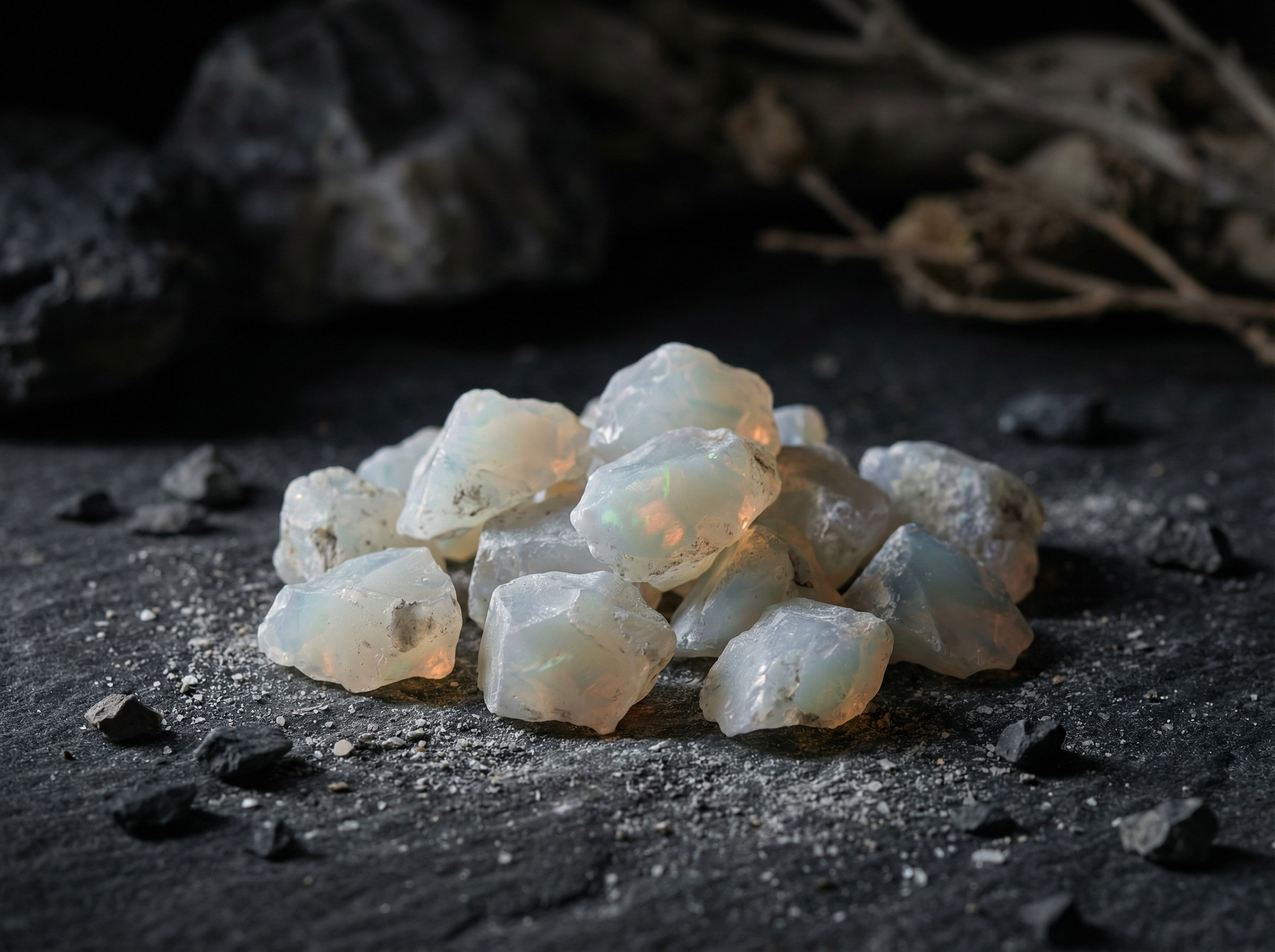 Crushed white fire opal is a unique gemstone material formed from ancient volcanic activity. Its mesmerizing play of colors is particularly remarkable – shimmering shades of blue, green, and golden reflections dance across its milky surface, even in powdered form. This rare and natural stone represents hope, purity, and change. At Monetto Rings, we use it to give our partner rings a subtle yet radiant sparkle – a piece of natural magic in every detail.