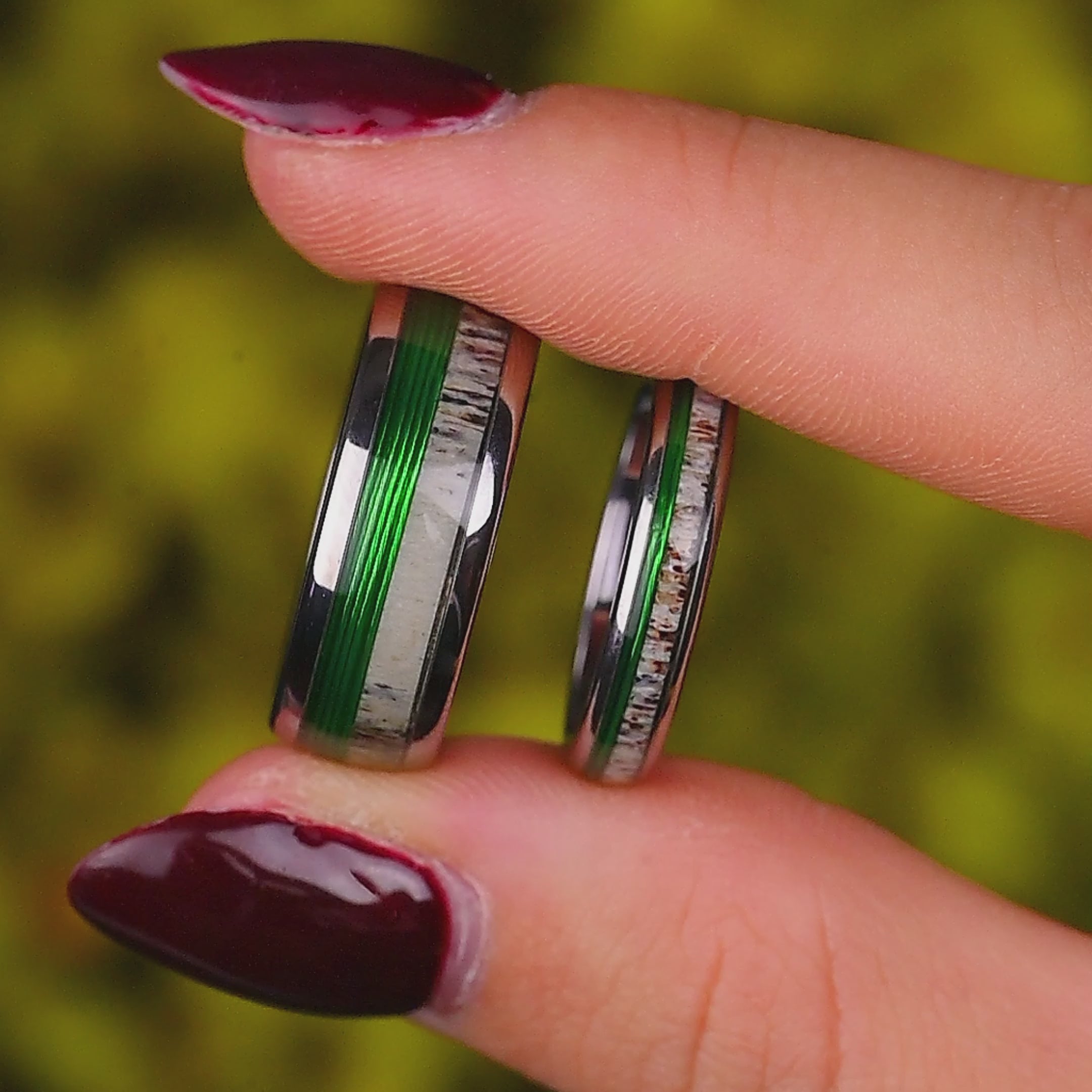 The Horizont – a set of green fishing line and deer antler rings – a remarkable fusion of natural beauty and outdoor spirit. This ring set features a vibrant green fishing line inlay paired with the rugged elegance of deer antler, capturing the essence of adventure and nature.