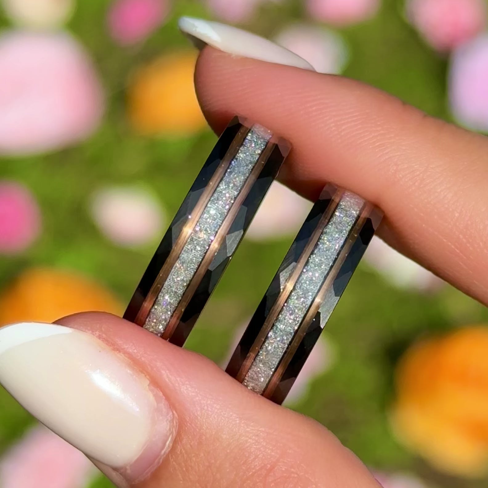 Zeus – Rings for men that exude strength and elegance. This remarkable ring features a striking combination of 24-karat gold leaf and meteorite inlays, set in a robust black hammered tungsten band.