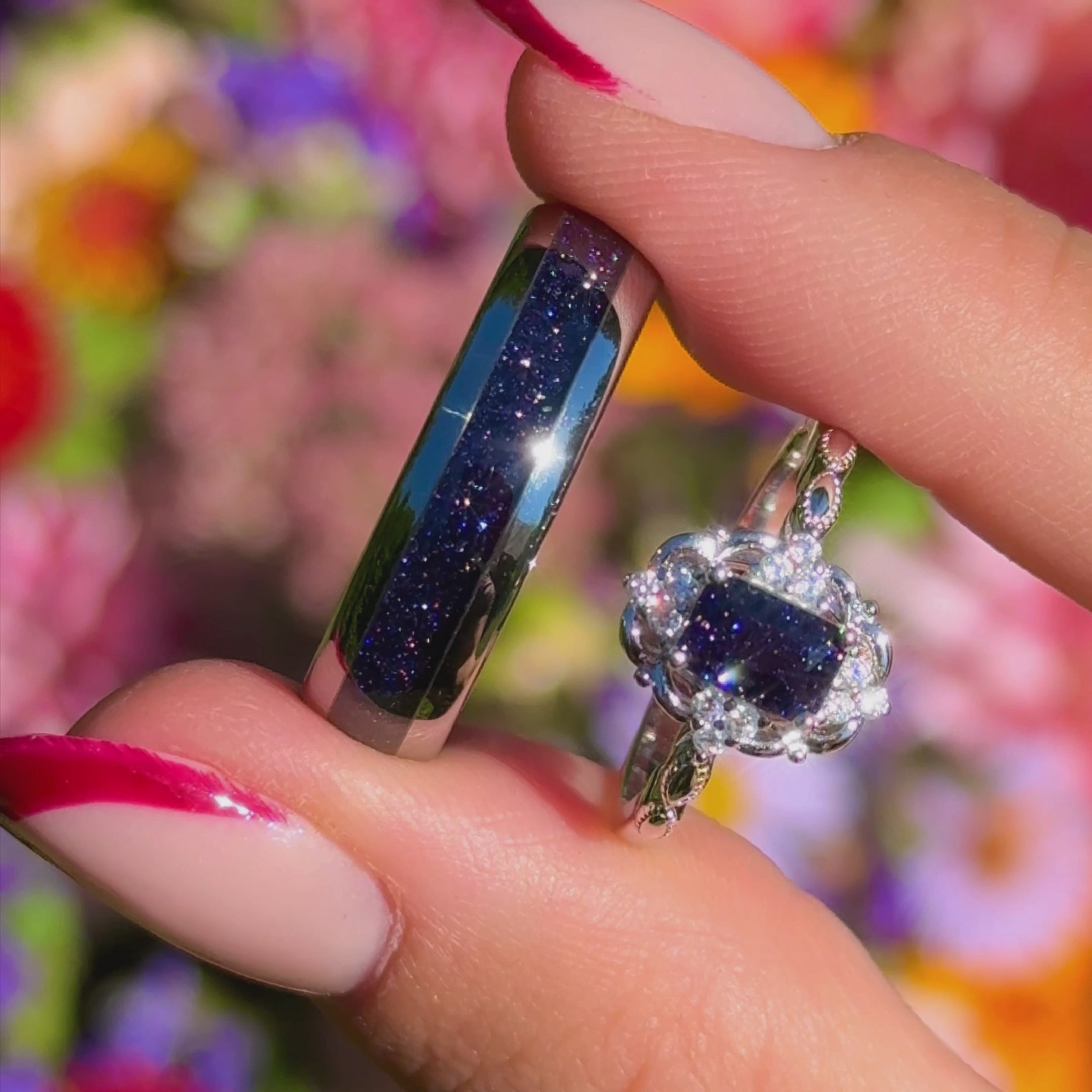 Made for couples who reach for the galaxies , Stardust is a couple's ring set that captures the ethereal beauty of the cosmos. This striking ring features a mesmerizing nebula inlay on a sleek black band.